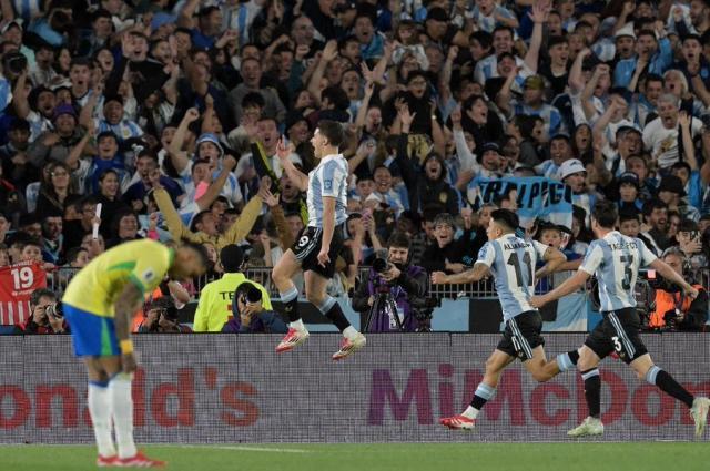 上半场,阿根廷队连进3球。那3球,都跟巴西队后防线失误有关。胡利安·阿尔瓦雷斯第4分钟打进的第一球,恩佐·费尔南德斯第12分钟打进的第二球,巴西中卫穆里略均难辞其咎。第一球,阿尔马达左路传中,阿尔瓦雷斯与巴西队左后卫阿拉纳争抢,皮球打在穆里略的腿上弹起,顺势插上的“小蜘蛛”射门中的。第二球,阿根廷队右路传中,穆里略抬脚挡了一下,但没挡住皮球,他身后的恩佐·费尔南德斯抬脚就射。阿根廷队所进的第三球,暴露出巴西队整体防守的问题。阿根廷人在巴西队禁区前左右转移,连传数脚,如入无人之境。最后一击,恩佐·费尔南德斯右路斜传禁区,麦卡利斯特抢在出击的本托前将球打进。那个球,穆里略和阿拉纳也有责任。